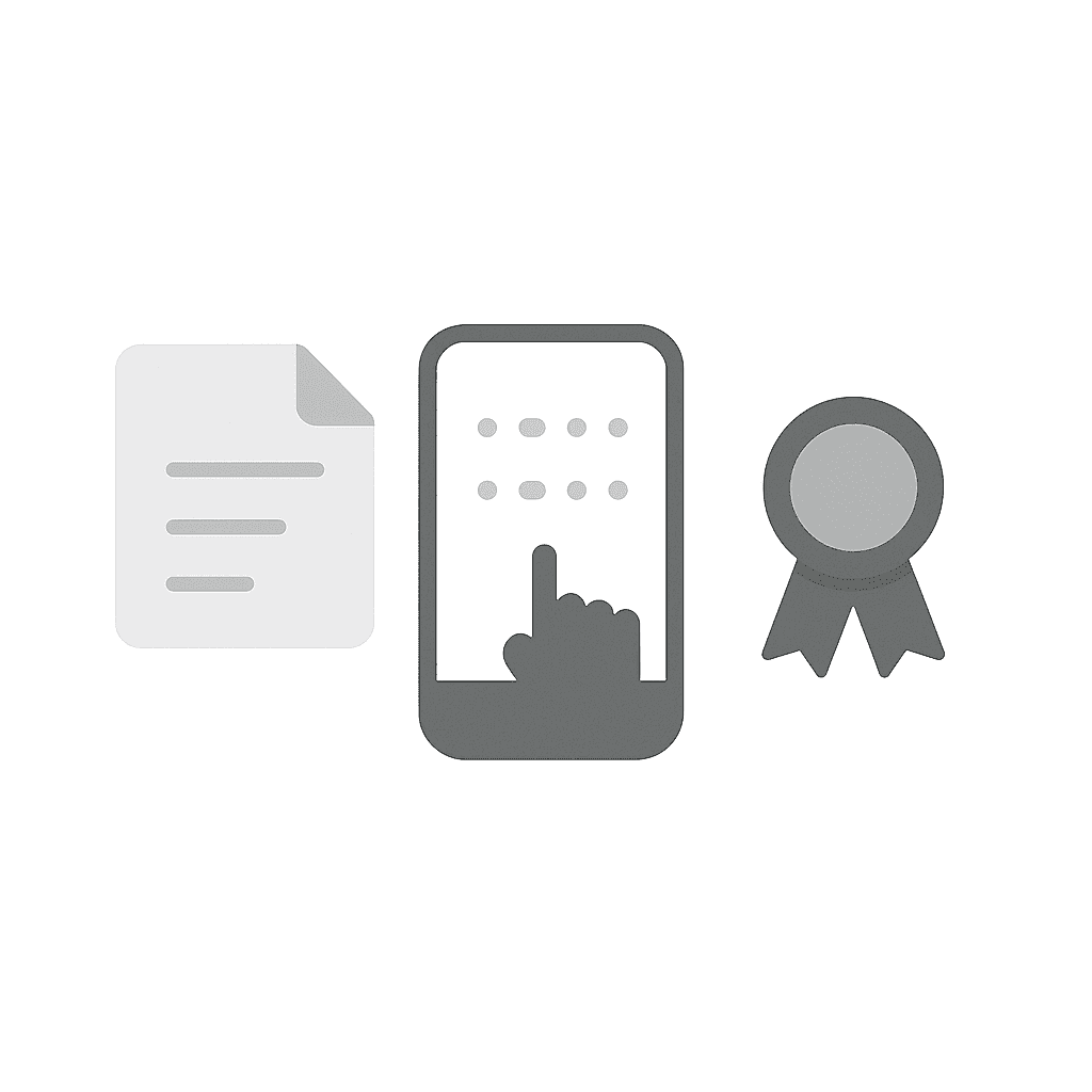 Graustufen-Abbildung eines Zertifikats mit Häkchen und Siegel – symbolisiert erfolgreichen Kursabschluss und offizielle Bestätigung.